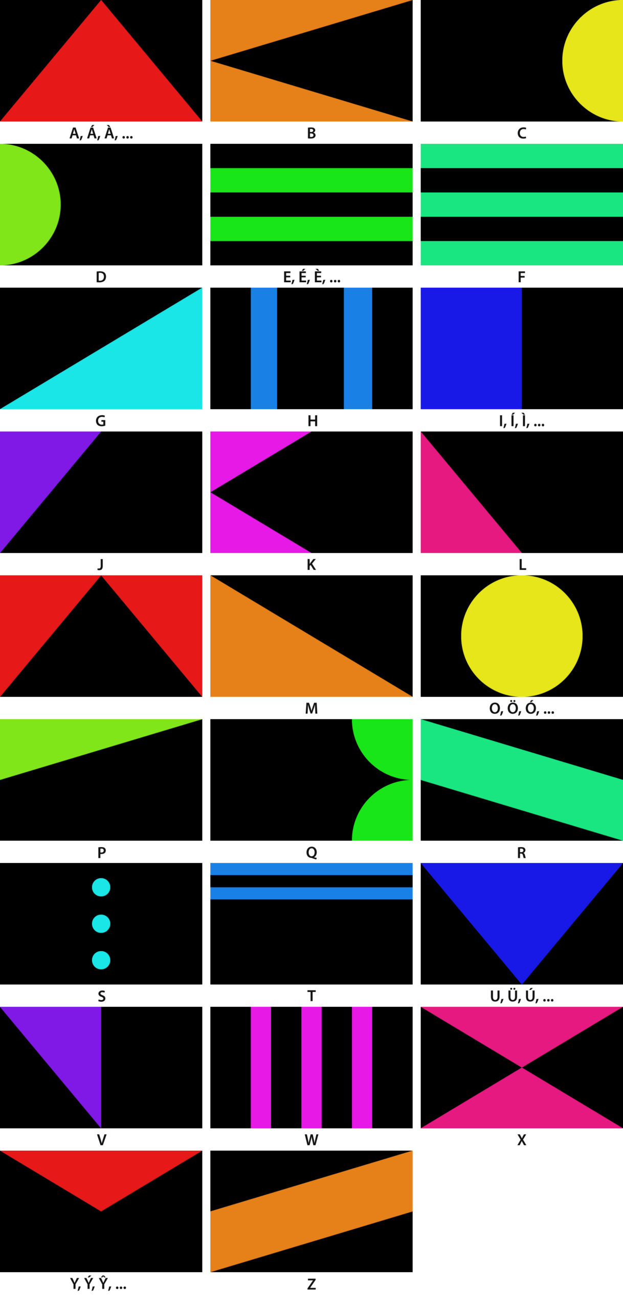 - Über die Farbzusammenstellung entscheidet der Anfangsbuchstabe des Namens: Dafür haben wir das Alphabet auf dem Farbkreis sortiert und nutzen den Anfangsbuchstaben des eingegbenen Namens als Startpunkt. Danach färben sich dann die Folgezeichen um eine Farbkreis-Rotation von 45 Grad ein.